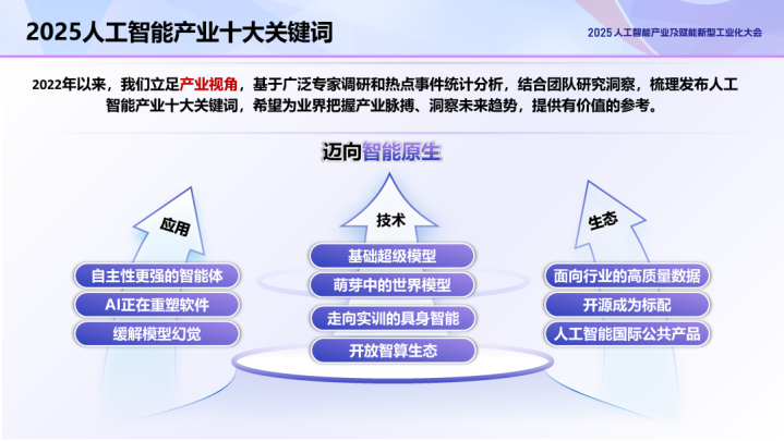 会上,中国信通院发布了“2025人工智能产业十大关键词”,即基础超级模型、自主性更强的智能体、走向实训的具身智能、萌芽中的世界模型、AI正在重塑软件、开放智算生态、面向行业的高质量数据集、开源成为标配、缓解模型幻觉、人工智能国际公共产品。